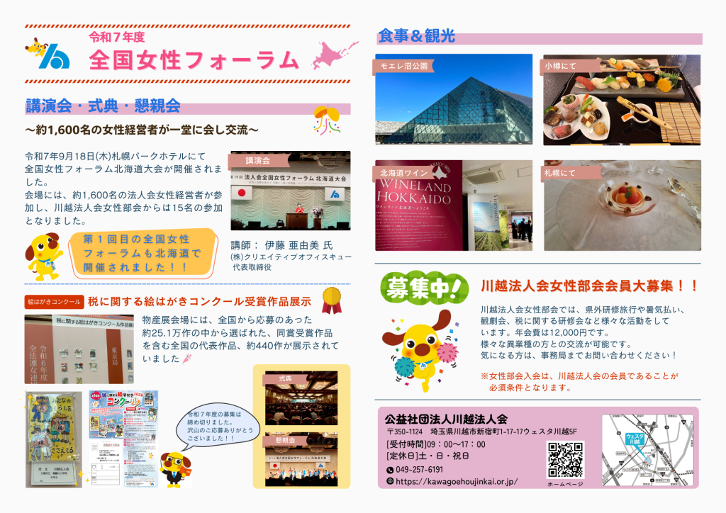 10月27日(日)~28日(月)、飯能名栗温泉にて一泊の女性部会研修会を開催いたしました。渋沢栄一記念館、冠稲荷神社、妻沼聖天山歓喜院をめぐり、二日目には話題のムーミンバレーパークや竹寺を散策しました。 - 女性部会主催で川越税務署長講演会を開催